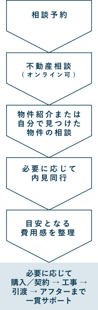 現地を一緒に見ながら、劣化や使いにくさ、修繕・改装の注意点、空間の特性などを、目視で分かる範囲でお伝えします。